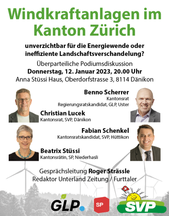 Eine überparteiliche Podiumsdiskussion zu den Windkraftanlagen im Kanton Zürich. Sind solche Anlagen unverzichtbar für die Energiewende oder eine ineffiziente Landschaftsverschandelung?